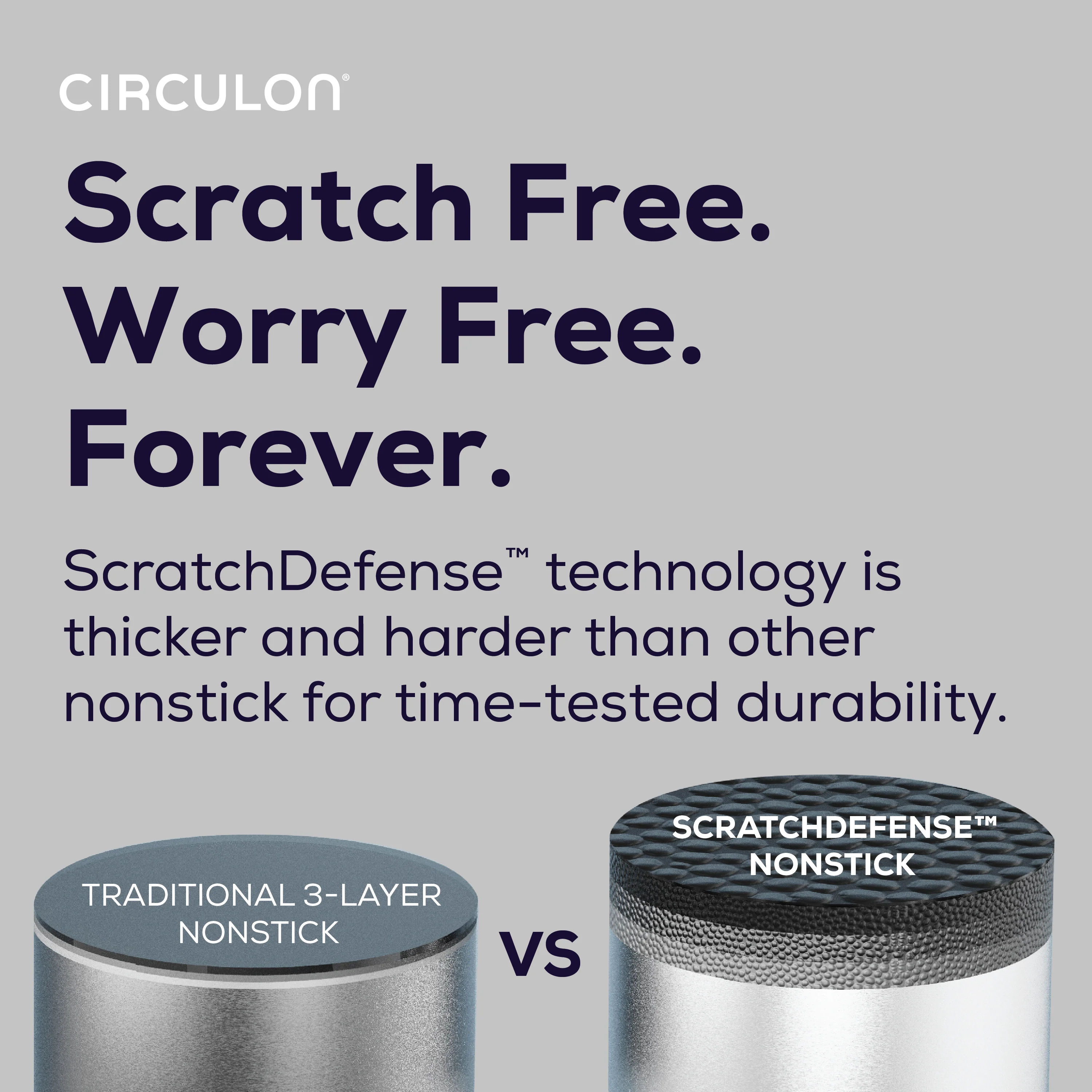 From the inventors of hard-anodized nonstick cookware comes the Circulon A1 Series with ScratchDefense™ Technology. Open up a new dimension in scratch resistance and unbeatable nonstick performance and longevity with groundbreaking ScratchDefense™ nonstick technology that applies aerospace-grade durability to eliminate scratching, sticking, and flaking for our most advanced nonstick yet. Cook with complete confidence using these dishwasher-safe pots and pans with a triple-layer nonstick cooking surface that lasts 130x longer than the competition and stands up to laboratory tests simulating 200+ years of daily wear and tear. An aluminum core delivers fast, all-over heat distribution and a thick, induction-suitable stainless steel base boosts durability and heat retention. Circulon ScratchDefense™: EXTREME NONSTICK THAT WON’T SCRATCH. EVER.